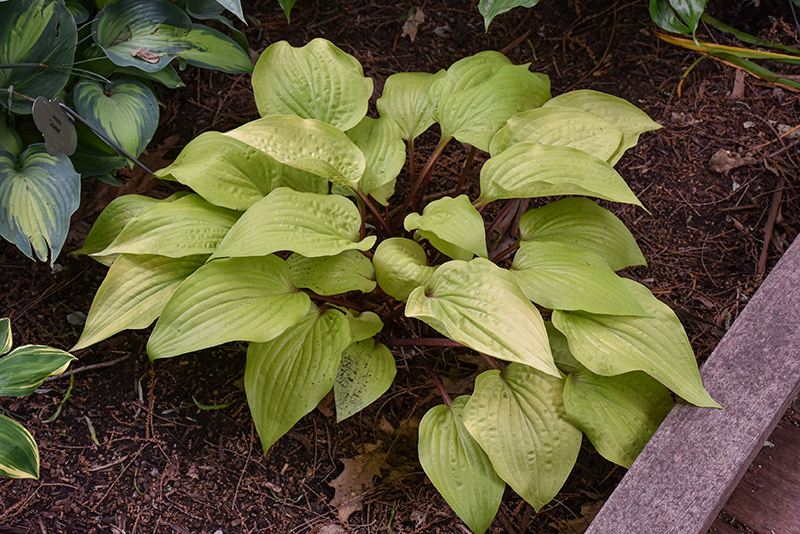 A unique hosta with graceful lance-shaped bright yellow leaves, rising on crimson petioles; leaves age to chartreuse later; provides beautiful texture and contrast to other plants; purple flowers on crimson scapes in July
