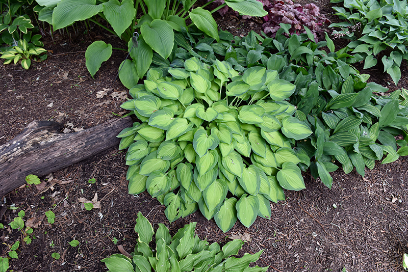 Sweet Home Chicago Hosta features dainty spikes of lavender tubular flowers rising above the foliage in mid summer. Its attractive textured heart-shaped leaves remain chartreuse in colour with distinctive grayish green edges and tinges of white throughout the season.