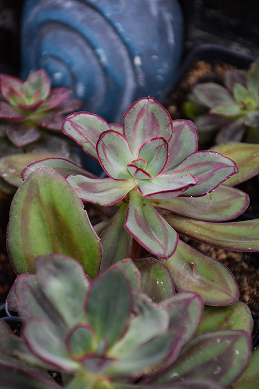 Other Names: Hens And Chicks Description: This variety is very drought tolerant, producing rosettes of spoon shaped foliage that is olive green, with vivid red margins; distinctive coral pink and yellow flowers on tall bracts in summer; ideal for containers in bright indoor areas Features & Attributes Painted Echeveria features unusual bracted coral-pink tubular flowers with yellow overtones and yellow tips rising above the foliage from early to mid summer. Its attractive succulent oval leaves remain olive green in color with distinctive red edges throughout the year. This is a dense herbaceous evergreen houseplant with tall flower stalks held atop a low mound of foliage. Its relatively fine texture sets it apart from other indoor plants with less refined foliage. This plant should not require much pruning, except when necessary to keep it looking its best. Planting & Growing When grown indoors, Painted Echeveria can be expected to grow to be only 5 inches tall at maturity extending to 12 inches tall with the flowers, with a spread of 5 inches. It grows at a medium rate, and under ideal conditions can be expected to live for approximately 20 years. This houseplant will do well in a location that gets either direct or indirect sunlight, although it will usually require a more brightly-lit environment than what artificial indoor lighting alone can provide. It prefers dry to average moisture levels with very well-drained soil, and may die if left in standing water for any length of time. This plant should be watered when the surface of the soil gets dry, and will need watering approximately once each week. Be aware that your particular watering schedule may vary depending on its location in the room, the pot size, plant size and other conditions; if in doubt, ask one of our experts in the store for advice. It is not particular as to soil pH, but grows best in sandy soil. Contact the store for specific recommendations on pre-mixed potting soil for this plant. There are many factors that will affect the ultimate height, spread and overall performance of a plant when grown indoors; among them, the size of the pot it's growing in, the amount of light it receives, watering frequency, the pruning regimen and repotting schedule. Use the information described here as a guideline only; individual performance can and will vary. Please contact the store to speak with one of our experts if you are interested in further details concerning recommendations on pot size, watering, pruning, repotting, etc. -- THIS IS A HOUSEPLANT AND IS NOT MEANT TO SURVIVE THE WINTER OUTDOORS IN OUR CLIMATE -- Characteristics