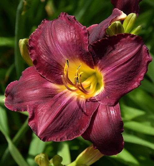 Large, shimmering purple blooms with chartreuse-yellow centers in mid-summer; semi-evergreen tetraploid; a spectacular color accent to the garden or border