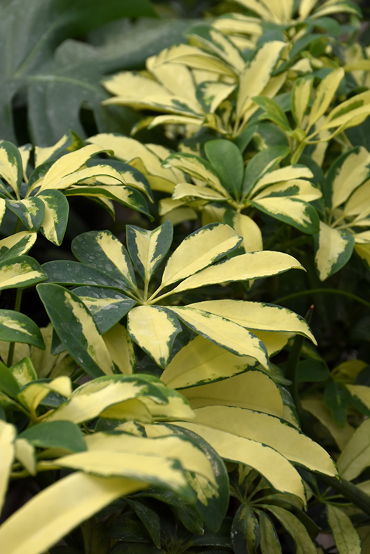 Trinette Variegated Schefflera's attractive glossy oval compound leaves remain dark green in colour with showy yellow variegation and tinges of creamy white throughout the year on a plant with a round habit of growth.