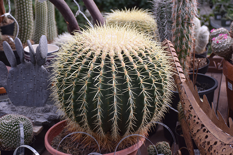 Golden Barrel Cactus is a succulent evergreen plant. It is a member of the cactus family, which are grown primarily for their characteristic shapes, their interesting features and textures, and their high tolerance for hot, dry growing environments. Like all cacti, it doesn't actually have leaves, but rather modified succulent stems that comprise the bulk of the plant, and which are designed to hold water for long periods of time. This particular cactus is valued for its distinctive barrel shape, and usually grows as a single spiny ribbed green stem. This plant has yellow cup-shaped flowers held atop the stems from late spring to early summer, which are interesting on close inspection.