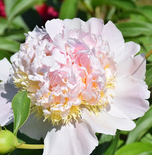 Top Brass Peony features bold lightly-scented double white flowers with shell pink overtones and yellow centers at the ends of the stems from mid to late spring. The flowers are excellent for cutting. Its lobed compound leaves remain green in colour throughout the season.