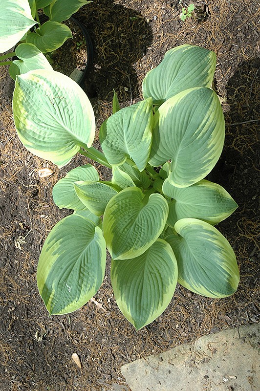 Blue-green leaved hosta, with butter-cream variegation and slightly wavy margins; provides beautiful texture and contrast to other plants; lavender spikes of flowers in early to mid-summer