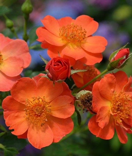 A lovely compact and low mounding bush crowned with striking spicy orange blooms that are symmetrical and classic in form, eminating a mild scent; wonderful as a groundcover or massed in a low border; very disease resistant