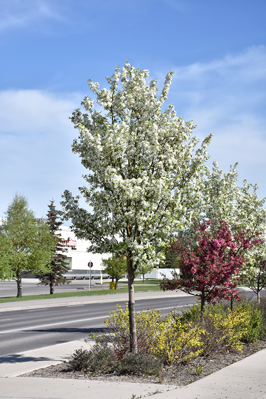 A character ornamental for colder climates with fragrant white flowers in spring and persistent bright red fruit in fall; a narrow, columnar habit of growth; needs well-drained soil and full sun, an excellent choice for smaller landscapes