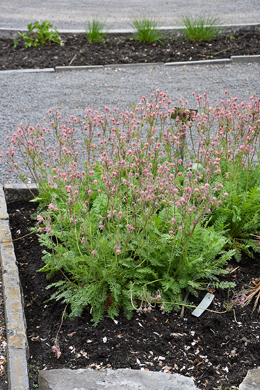 Unusual and interesting rose colored, nodding bowl shaped flowers rise above green fern-like foliage; flowers followed by interesting seed heads resembling feathery plumes; drought tolerant, great for use in borders, containers and cottage gardens