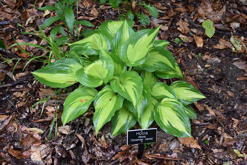 Christmas Candy Hosta will grow to be about 14 inches tall at maturity extending to 22 inches tall with the flowers, with a spread of 24 inches. When grown in masses or used as a bedding plant, individual plants should be spaced approximately 20 inches apart. Its foliage tends to remain dense right to the ground, not requiring facer plants in front. It grows at a medium rate, and under ideal conditions can be expected to live for approximately 10 years. As an herbaceous perennial, this plant will usually die back to the crown each winter, and will regrow from the base each spring. Be careful not to disturb the crown in late winter when it may not be readily seen!