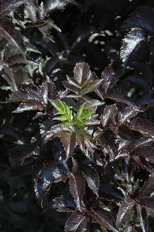 Black Tower Elder features showy clusters of fragrant shell pink flowers held atop the branches in early summer, which emerge from distinctive rose flower buds. It has attractive black deciduous foliage which emerges light green in spring. The serrated compound leaves are highly ornamental but do not develop any appreciable fall colour. The black fruits are held in clusters in early fall.