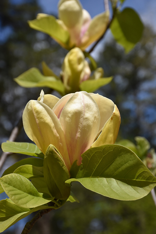 An exquisitely beautiful magnolia with yellow blooms that are striped with pink; a small tree or large shrub with a tidy form and large relatively coarse leaves; flowers appear late, just as foliage emerges; an ideal landscape or garden accent