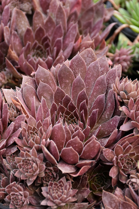 Chick Charms® Chocolate Kiss™ Hens And Chicks will grow to be only 3 inches tall at maturity extending to 12 inches tall with the flowers, with a spread of 12 inches. When grown in masses or used as a bedding plant, individual plants should be spaced approximately 10 inches apart. Its foliage tends to remain low and dense right to the ground. It grows at a medium rate, and under ideal conditions can be expected to live for approximately 20 years. As an herbaceous perennial, this plant will usually die back to the crown each winter, and will regrow from the base each spring. Be careful not to disturb the crown in late winter when it may not be readily seen!