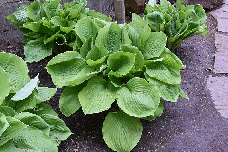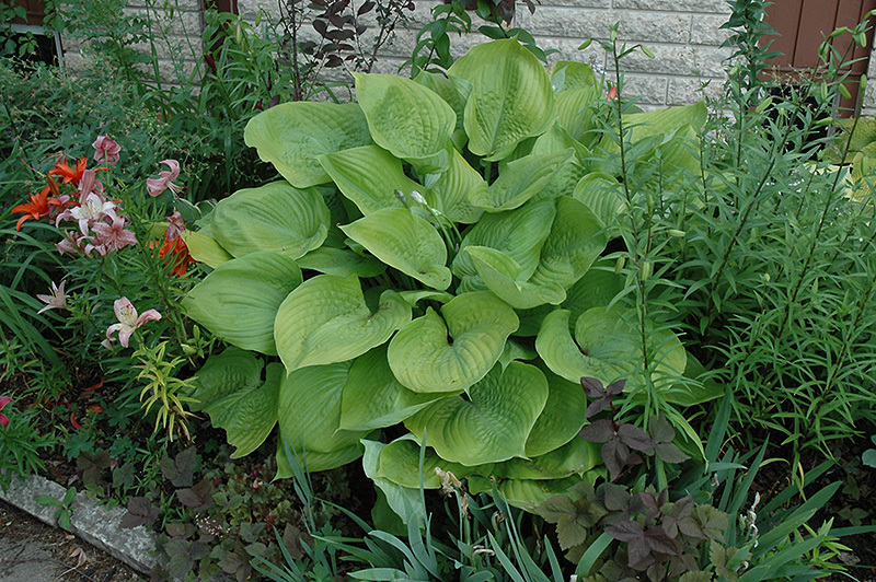 Sum and Substance Hosta will grow to be about 3 feet tall at maturity, with a spread of 5 feet. When grown in masses or used as a bedding plant, individual plants should be spaced approximately 4 feet apart. Its foliage tends to remain dense right to the ground, not requiring facer plants in front. It grows at a medium rate, and under ideal conditions can be expected to live for approximately 10 years. As an herbaceous perennial, this plant will usually die back to the crown each winter, and will regrow from the base each spring. Be careful not to disturb the crown in late winter when it may not be readily seen!