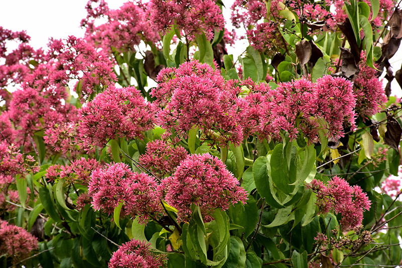 An outstanding tall shrub or small tree featuring clusters of fragrant white flowers in mid to late summer; spent flowers fall to reveal bright red bracts that are equally showy; open, upright-sprawling habit of growth, benefits from regular pruning