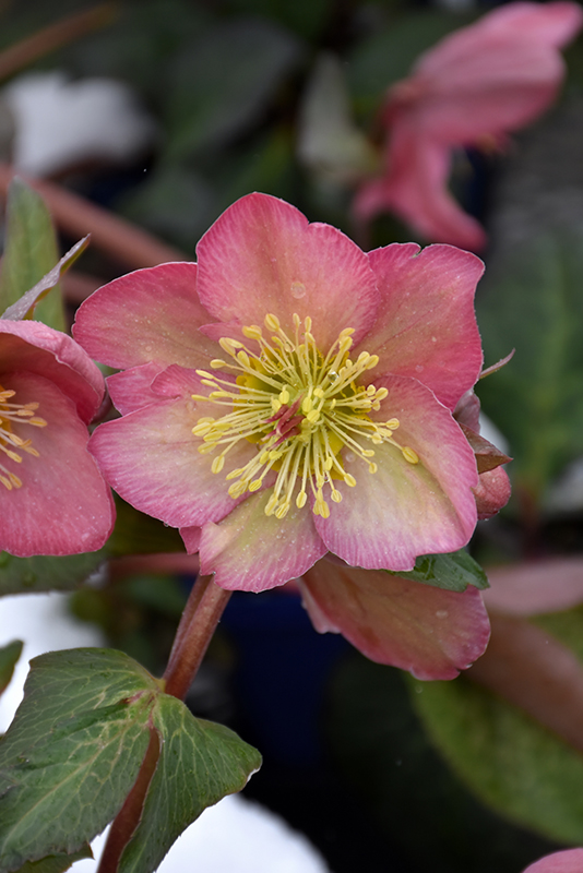 FrostKiss™ Cheryl's Shine® Hellebore features showy nodding pink cup-shaped flowers with peach overtones and chartreuse eyes at the ends of the stems from late winter to early spring. Its attractive serrated oval compound leaves remain dark green in colour with distinctive light green veins throughout the year.