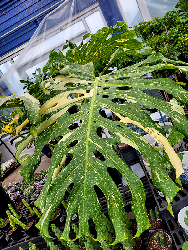 This variety presents stunning large glossy green leaves with white variegation and deep cut outs; can be allowed to climb trellises or other structures; flowering or fruit production is highly unlikely indoors; a stunning accent plant for indoor spaces