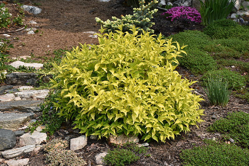 Honeybee™ Bush Honeysuckle features showy panicles of yellow trumpet-shaped flowers along the branches from early summer to early fall. It has attractive gold foliage with hints of light green which emerges yellow in spring. The pointy leaves are highly ornamental and turn outstanding shades of coppery-bronze and in the fall.