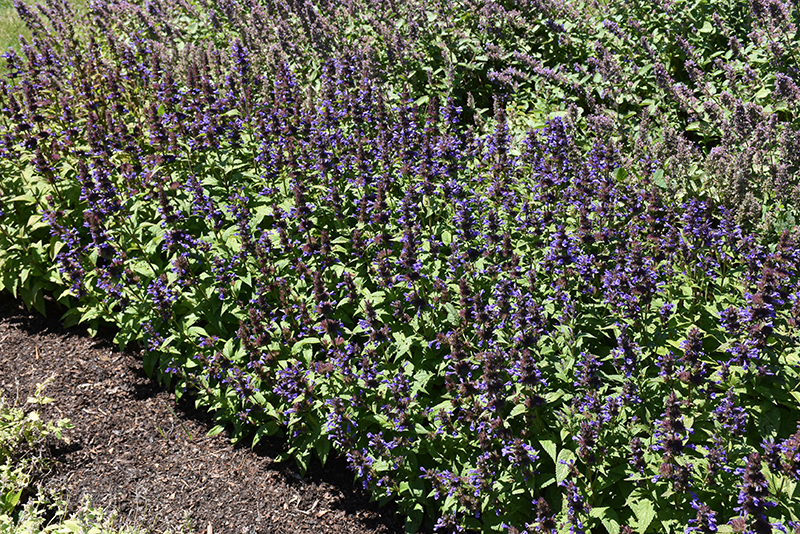 A showy selection with very large tubular blooms of violet blue from early to late summer, on compact, stout stems cloaked with large serrated foliage; not prone to flop and will bloom in waves all summer; perfect for patio containers and border fronts