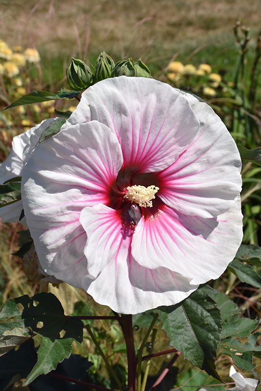 Angel Eyes Hibiscus features bold white round flowers with dark red eyes and a hot pink flare along the stems from mid summer to early fall. Its large serrated lobed leaves remain green in colour throughout the season.