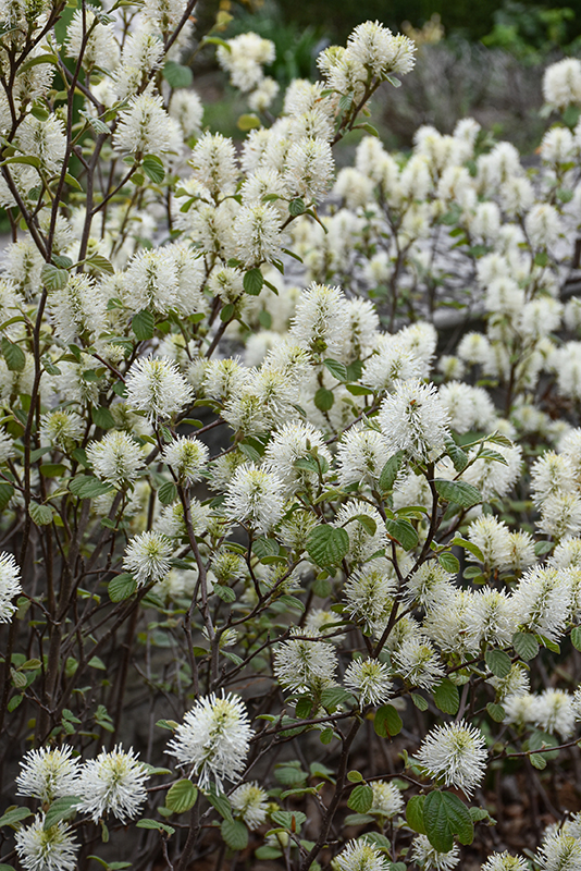 Legend Of The Fall® Fothergilla features showy spikes of fragrant white flowers rising above the foliage in mid spring before the leaves. It has bluish-green deciduous foliage. The round leaves turn outstanding shades of scarlet, orange and yellow in the fall. The smooth dark brown bark adds an interesting dimension to the landscape.