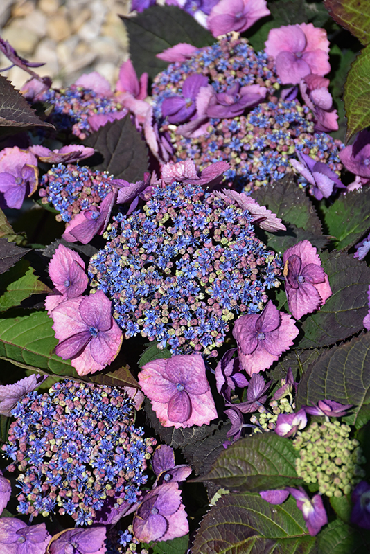 A bold yet compact shrub featuring rich pink to purple lacecap flowers, depending on soil acidity, around greenish centers that fade to blue; flowers are richer purple in acidic soil; reliably re-blooms on new and old wood; bright burgundy stems