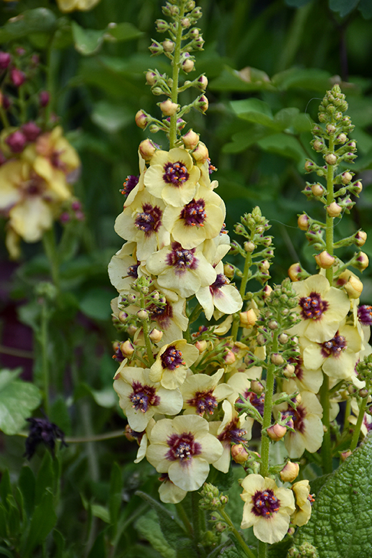 Dark Eyes Mullein has masses of beautiful spikes of buttery yellow flowers with dark red eyes rising above the foliage from mid spring to mid summer, which are most effective when planted in groupings. The flowers are excellent for cutting. Its crinkled oval leaves remain grayish green in colour throughout the season.
