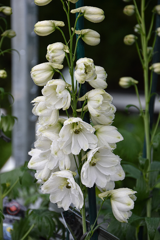 Guardian White Larkspur will grow to be about 24 inches tall at maturity extending to 4 feet tall with the flowers, with a spread of 24 inches. When grown in masses or used as a bedding plant, individual plants should be spaced approximately 18 inches apart. It tends to be leggy, with a typical clearance of 1 foot from the ground, and should be underplanted with lower-growing perennials. The flower stalks can be weak and so it may require staking in exposed sites or excessively rich soils. It grows at a medium rate, and under ideal conditions can be expected to live for approximately 10 years. As an herbaceous perennial, this plant will usually die back to the crown each winter, and will regrow from the base each spring. Be careful not to disturb the crown in late winter when it may not be readily seen!
