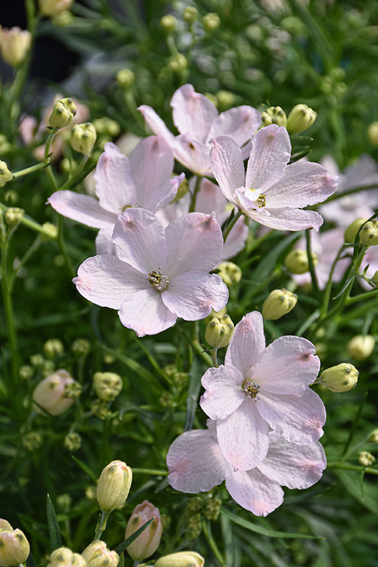 Summer Morning Delphinium has masses of beautiful panicles of shell pink flowers at the ends of the stems from late spring to late summer, which are most effective when planted in groupings. The flowers are excellent for cutting. Its crinkled ferny compound leaves remain dark green in colour throughout the season.
