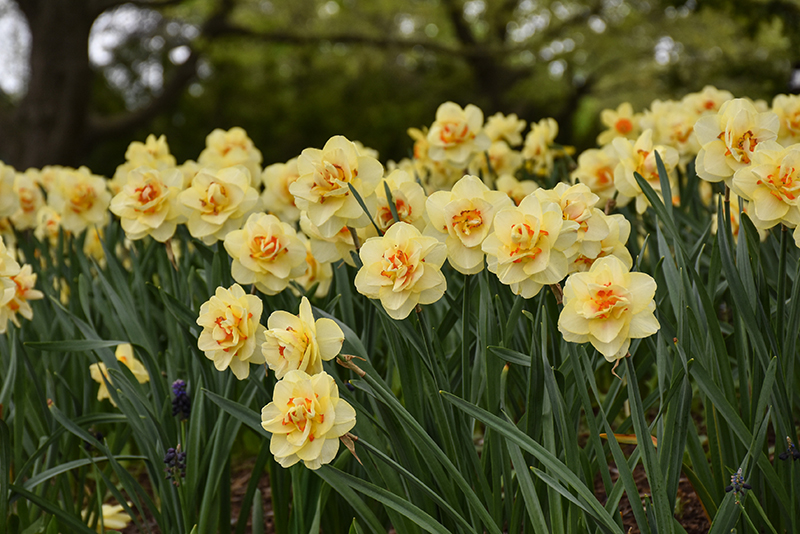Tahiti Daffodil has masses of beautiful fragrant double yellow trumpet-shaped flowers with orange overtones and orange centers at the ends of the stems in mid spring, which are most effective when planted in groupings. The flowers are excellent for cutting. Its grassy leaves remain dark green in colour throughout the season.
