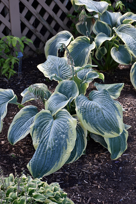 A beautiful extra large variety featuring dense mounds of powder blue, heart shaped leaves with creamy white margins; lavender flowers appear in mid-summer; adds texture, contrast and color to garden beds; prefers shaded areas
