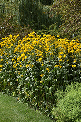 A tall and eye-catching selection presenting tall stems topped with drooping, golden yellow petals surrounding a green conical disc that matures to brown; spreads aggressively by underground rhizomes, best used for naturalizing or landscape applications