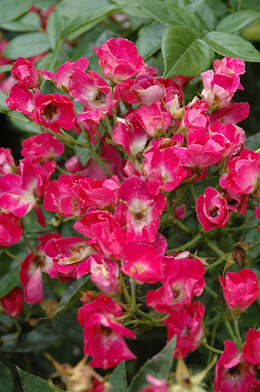 Papa Hemeray Rose is blanketed in stunning clusters of lightly-scented cherry red flowers with white eyes at the ends of the branches from early to late summer. The flowers are excellent for cutting. It has green deciduous foliage. The oval compound leaves turn yellow in fall. The fruits are showy red hips displayed from mid to late fall. The spiny brick red bark adds an interesting dimension to the landscape.