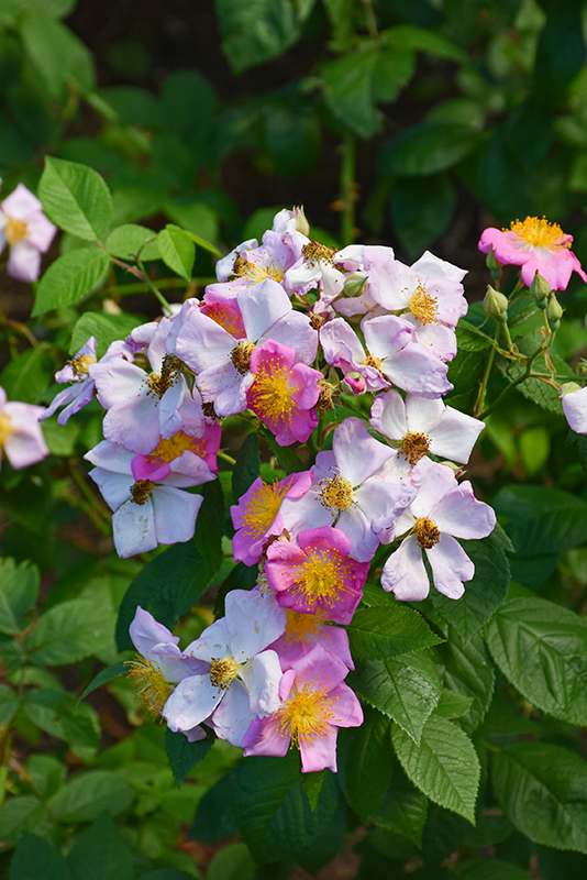 Climbing Wild Rose features showy clusters of lightly-scented pink flowers with gold eyes and white centers along the branches from early to mid summer. The flowers are excellent for cutting. It has emerald green deciduous foliage. The oval compound leaves do not develop any appreciable fall colour.