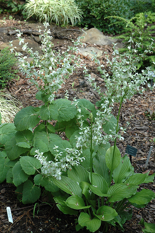 White Clary Sage has masses of beautiful spikes of white flowers with green bracts rising above the foliage from late spring to late summer, which are most effective when planted in groupings. The flowers are excellent for cutting. Its attractive large fragrant oval leaves remain dark green in colour throughout the season.