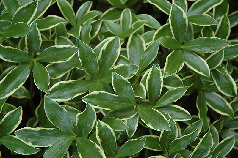 A cherished garden plant with glossy dark green leaves with white margins, and intoxicatingly fragrant white flowers in spring on a mounded shrub; a relatively fussy plant, needing light shade and well-drained soil; never move once established