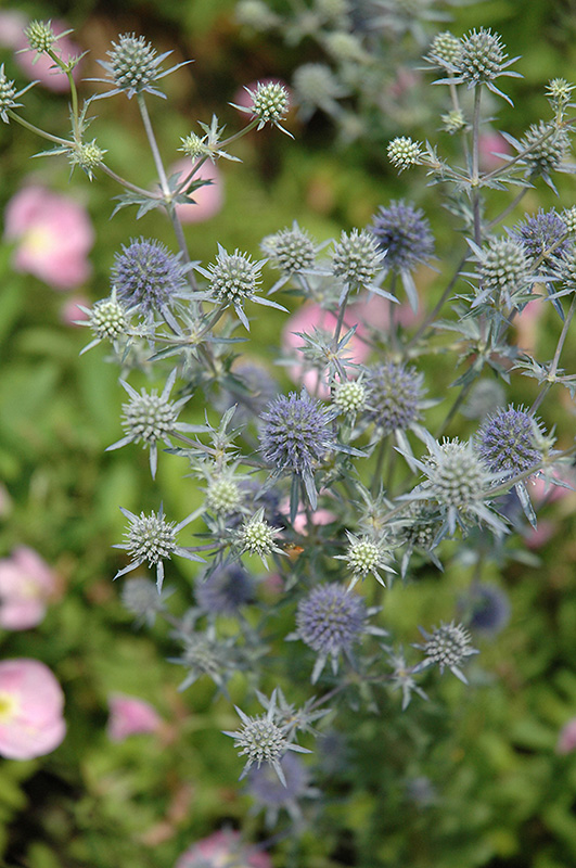 A sea holly with unusual and show-stopping prickly steel-blue flowers with darker blue stems, thistle-like; tolerates hot dry sites; attractive to butterflies; pair up with softer textured plants, beautiful in dried arrangements