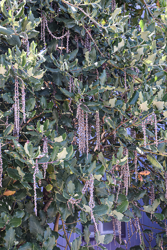 Silk Tassel Bush has masses of beautiful chains of white catkins with silver overtones hanging below the branches from early fall to late winter, which are most effective when planted in groupings. It has attractive dark green evergreen foliage. The glossy oval leaves are highly ornamental and remain dark green throughout the winter.