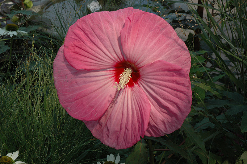 Party Favor Hibiscus features bold pink round flowers with red eyes at the ends of the stems from mid summer to early fall. Its large glossy oval leaves remain green in colour throughout the season.