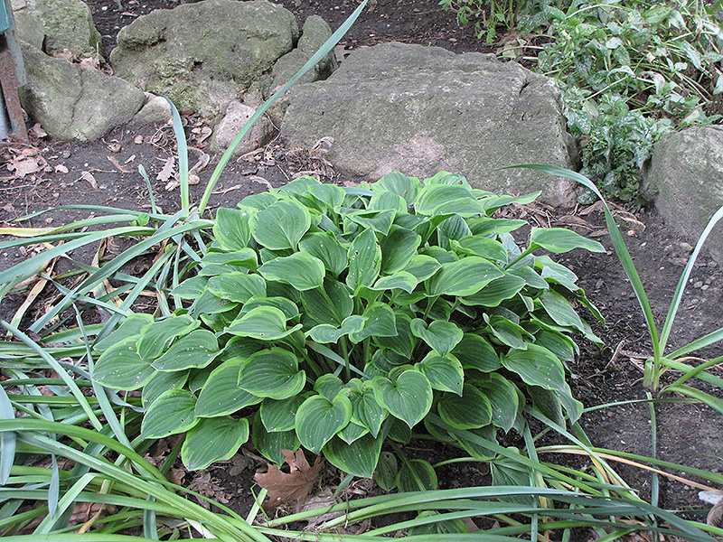 Hope Hosta will grow to be only 6 inches tall at maturity extending to 12 inches tall with the flowers, with a spread of 10 inches. When grown in masses or used as a bedding plant, individual plants should be spaced approximately 8 inches apart. Its foliage tends to remain low and dense right to the ground. It grows at a slow rate, and under ideal conditions can be expected to live for approximately 10 years. As an herbaceous perennial, this plant will usually die back to the crown each winter, and will regrow from the base each spring. Be careful not to disturb the crown in late winter when it may not be readily seen!