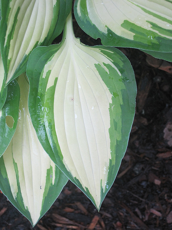 A pale cream leaf center with green margins that jet to the center; leaf is heart shaped and delicately twisted; spikes of pale purple flowers on reddish-pink scapes in mid-summer; a small hosta perfect for edging
