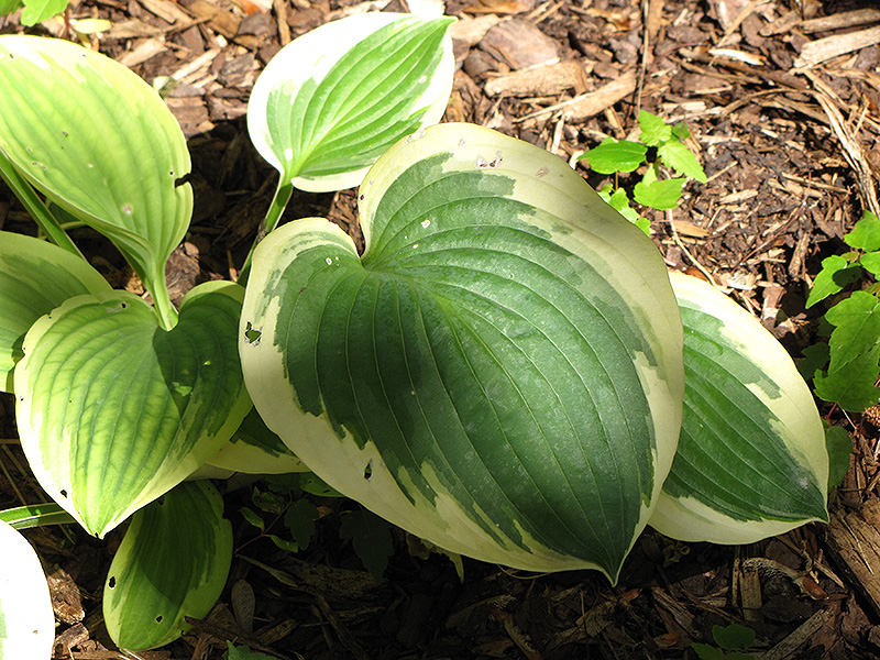 An intense blue leaf center with yellow margins that mature to white; leaf is rounded and heart shaped; spikes of lavender flowers in early summer; a striking specimen plant in the garden or border