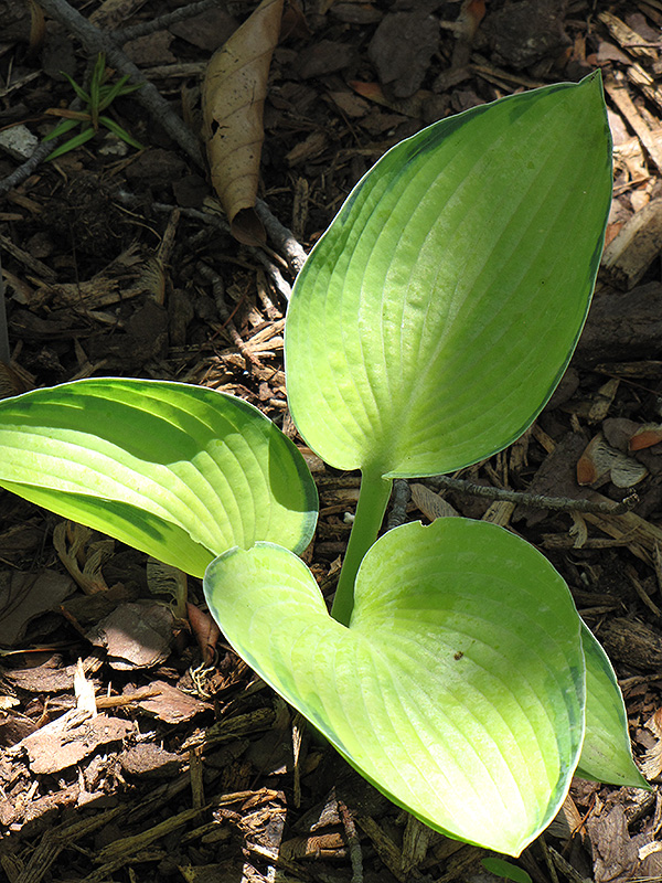 A golden leaf center with dark blue-green margins; leaf is heart shaped and nicely corrugated at maturity; spikes of white flowers in mid-summer; a striking specimen plant in the garden or border