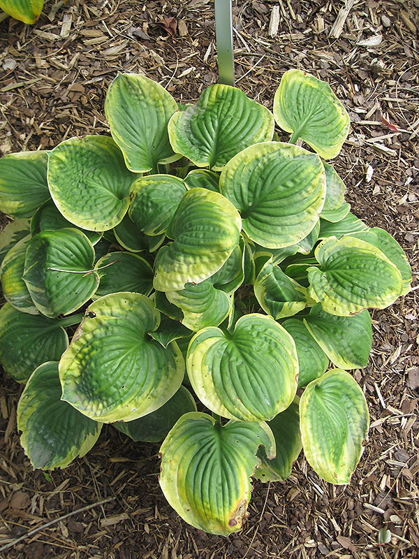 A blue-green leaf center with lovely gold margins; leaf is heart shaped, with thick substance; spikes of pale lavender flowers in mid-summer; a stunning specimen in the garden or border