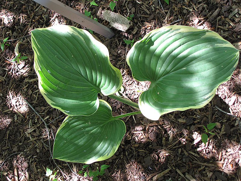 A sea green leaf center with wide yellowmargins that mature to cream; leaf is heart shaped and nicely ribbed; spikes of pale lavender flowers in early to mid-summer; a stunning large specimen in the garden or border