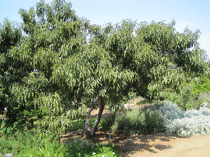 Common Peach will grow to be about 20 feet tall at maturity, with a spread of 20 feet. It has a low canopy with a typical clearance of 3 feet from the ground, and is suitable for planting under power lines. It grows at a medium rate, and under ideal conditions can be expected to live for 40 years or more. While it is considered to be somewhat self-pollinating, it tends to set heavier quantities of fruit with a different variety of the same species growing nearby.