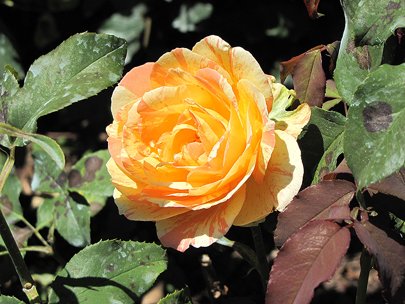 Rainbow Niagara Rose features showy lightly-scented double yellow flowers with orange overtones and pink stripes at the ends of the branches from early summer to mid fall. The flowers are excellent for cutting. It has dark green deciduous foliage. The glossy oval compound leaves do not develop any appreciable fall colour.