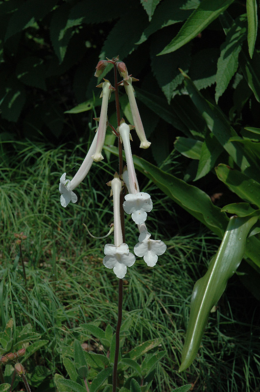 Hardy White Gloxinia features dainty spikes of white tubular flowers with shell pink throats dangling from the stems from late spring to mid summer. Its tomentose narrow leaves remain grayish green in colour throughout the season.