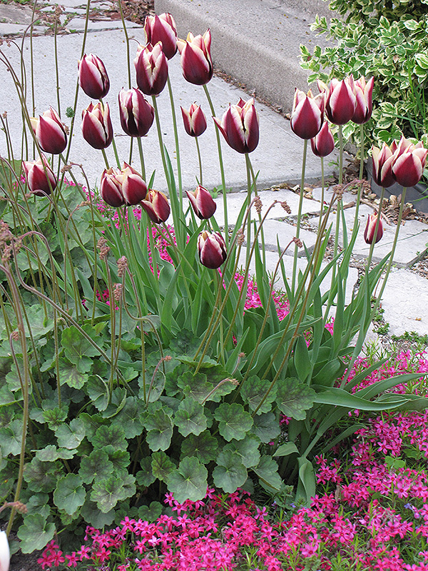 Leen Van der Mark Tulip will grow to be about 16 inches tall at maturity, with a spread of 14 inches. When grown in masses or used as a bedding plant, individual plants should be spaced approximately 6 inches apart. It grows at a medium rate, and under ideal conditions can be expected to live for approximately 10 years. As an herbaceous perennial, this plant will usually die back to the crown each winter, and will regrow from the base each spring. Be careful not to disturb the crown in late winter when it may not be readily seen! As this plant tends to go dormant in summer, it is best interplanted with late-season bloomers to hide the dying foliage.
