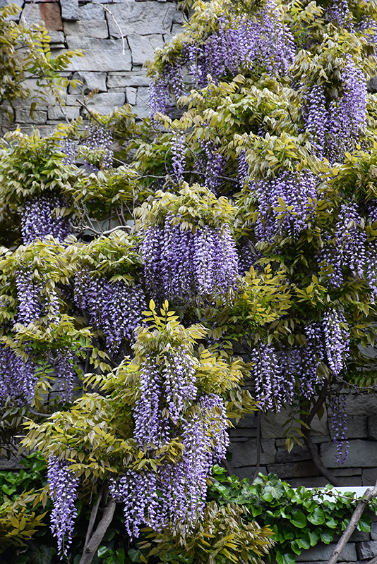 Macrobotrys Wisteria is smothered in stunning chains of fragrant blue pea-like flowers with violet overtones hanging below the branches from mid to late spring. It has green deciduous foliage which emerges coppery-bronze in spring. The narrow pinnately compound leaves turn yellow in fall.