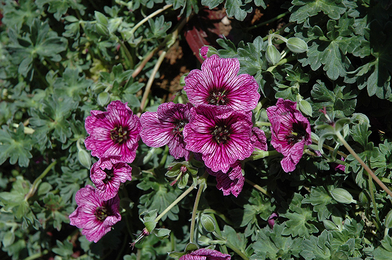 This variety presents a dense, low mat of grey-green leaves with bright pinkish-purple flowers, intricately veined with dark centers, covering the stems in spring, then off and on throughout the season; great for a rock garden or edging