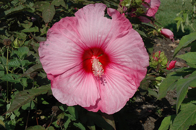 Stardust Hibiscus features bold shell pink round flowers with red eyes and buttery yellow anthers at the ends of the stems from mid summer to early fall. Its lobed leaves remain grayish green in colour with showy purple variegation throughout the season.
